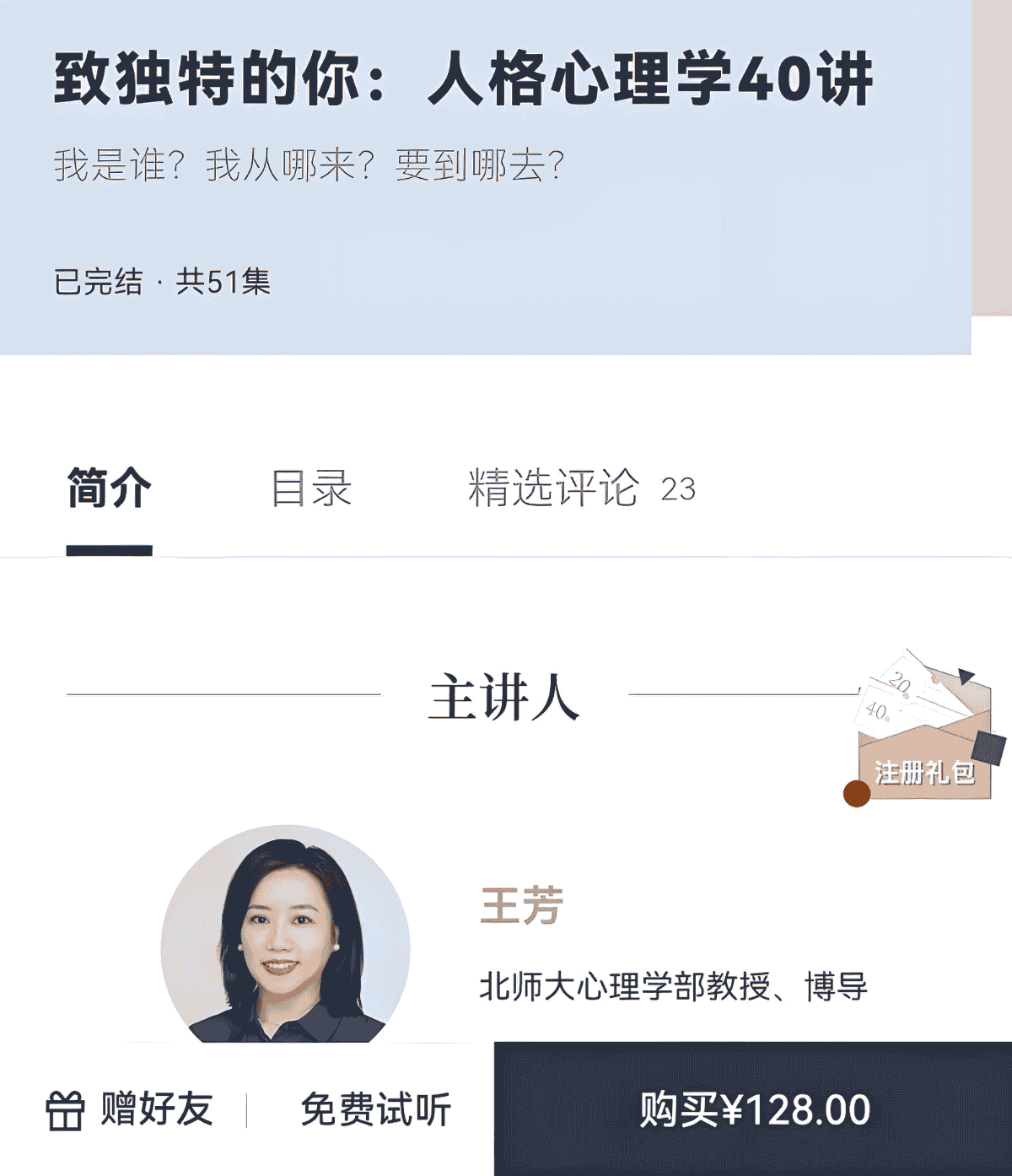 该课程由北京师范大学心理学部教授王芳主讲,围绕“我是谁?我从哪里来?我要到哪里去?”三大哲学命题展开。课程以人格心理学为科学窗口,系统拆解个体差异的形成机制与人生意义,帮助学习者跳出星座、MBTI等流行测试的标签化陷阱,建立基于实证研究的自我认知体系137。