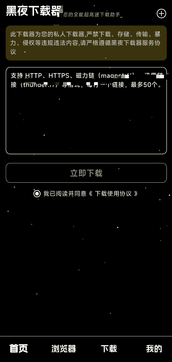 黑夜下载app是个资源下载工具,它支持很多种协议的下载,包括磁力链接、BT种子、HTTP/HTTPS等,使用方法也很简单直接把下载的连接复制粘贴过来就行了,下载的速度也非常快没有限速,直接跑满网速下载,大文件都能秒速下载完成。