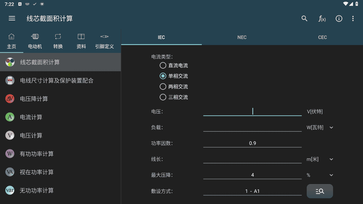 电工计算器app是一款能够帮助电工用户便捷计算的应用软件,提供了多种计算功能,涵盖了电压降计算、电流计算、电压计算、功率因数计算、无功功率计算等多种计算方式。