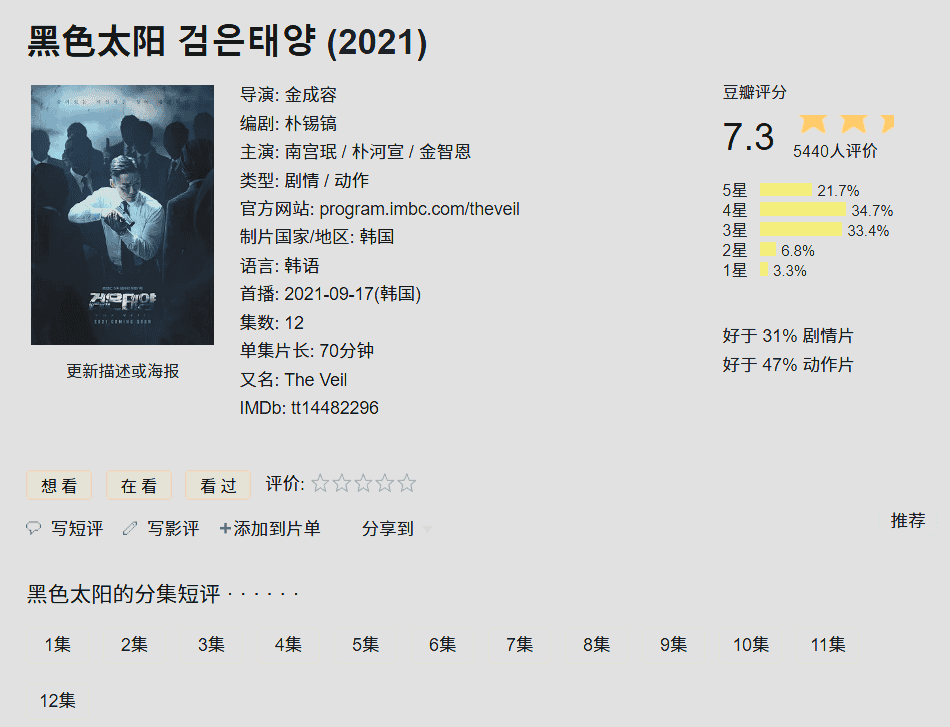 【黑色太阳 】2021 【韩剧】+番外 南宫珉 / 朴河宣 / 金智恩 1-12完结 1080P 中英文字幕 每部2G左右
